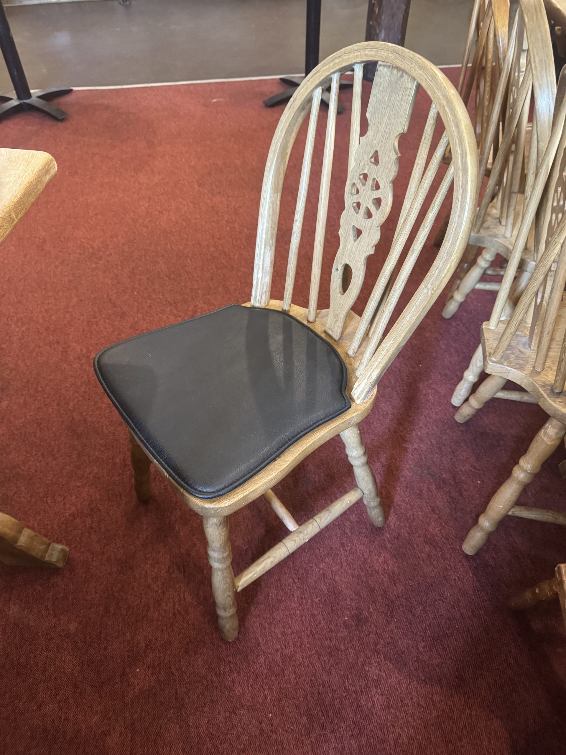 Der er hynder man kan benytte på stolene, så man sidder lidt blødere. De står i hjørnet i 2 trækasser. Husk at aftørre dem og lægge dem på plads efter brug