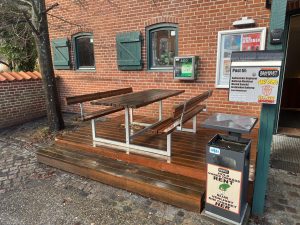 På væggen til højre for rampen, sidder et skab med en kontakt, hvor man kan tænde et kraftigt udendørs lys, hvis man skal rydde op efter mørkets frembrud.