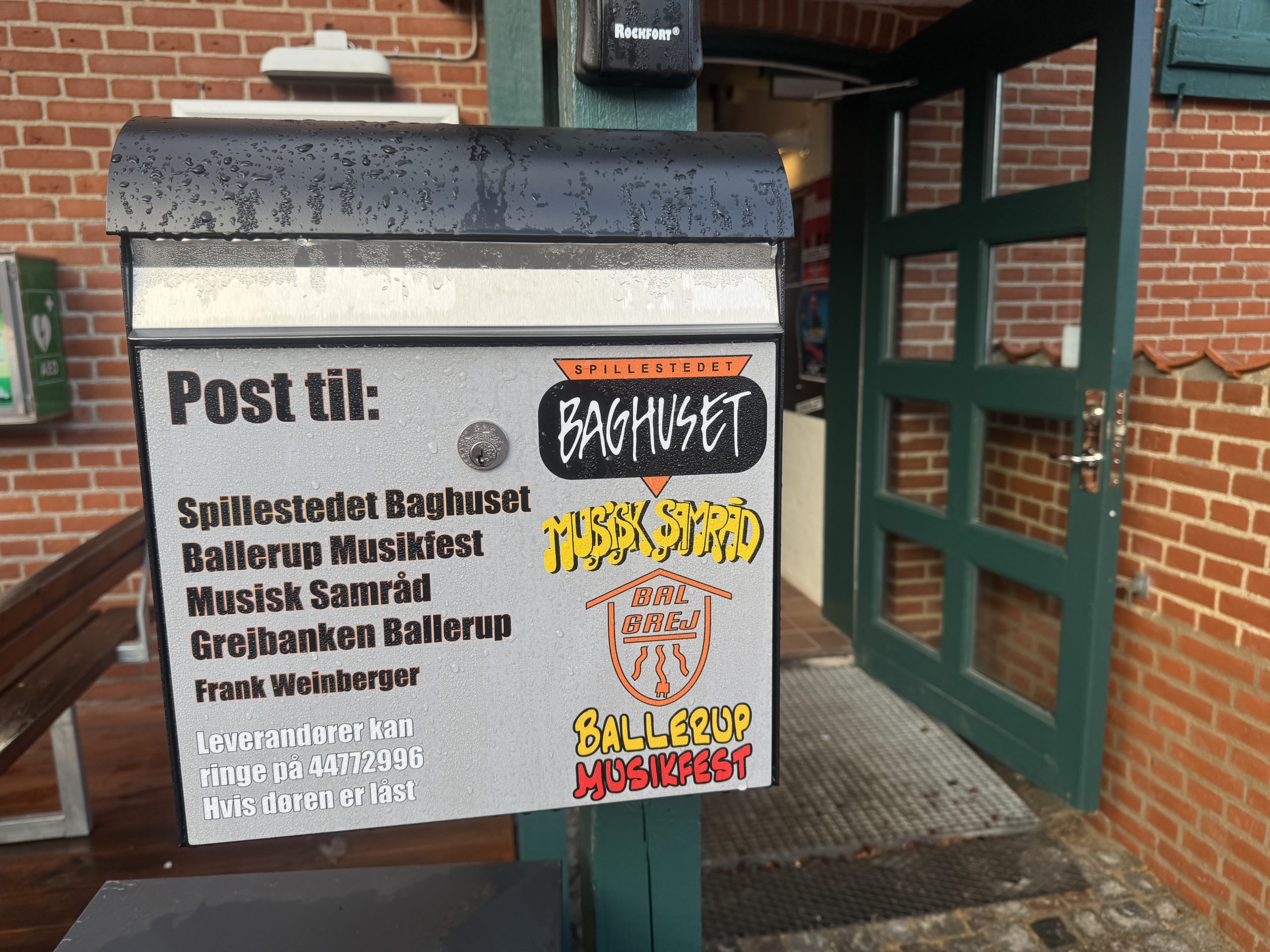 Der forefindes hjertestarter ved Baghuset, den hænger udendørs lige ved hoveddøren.